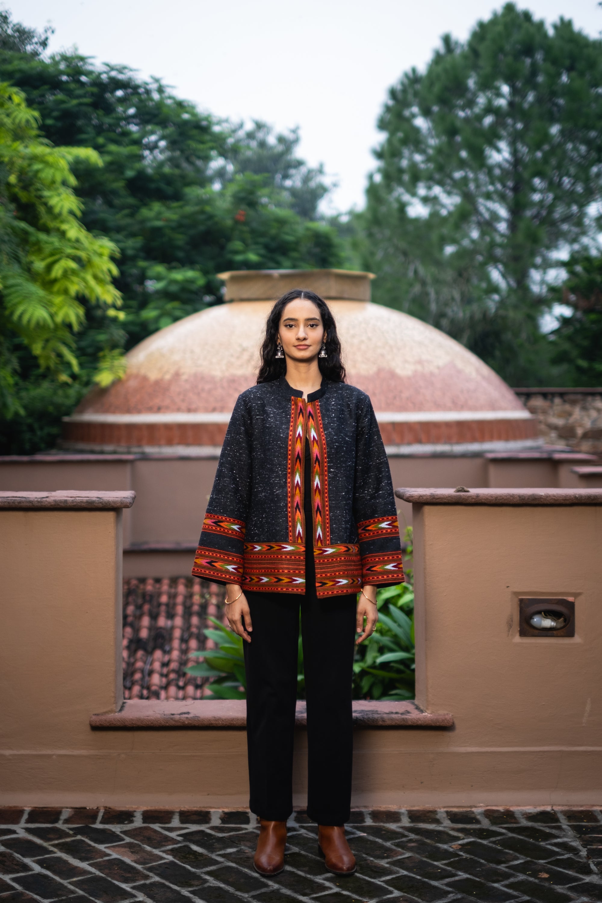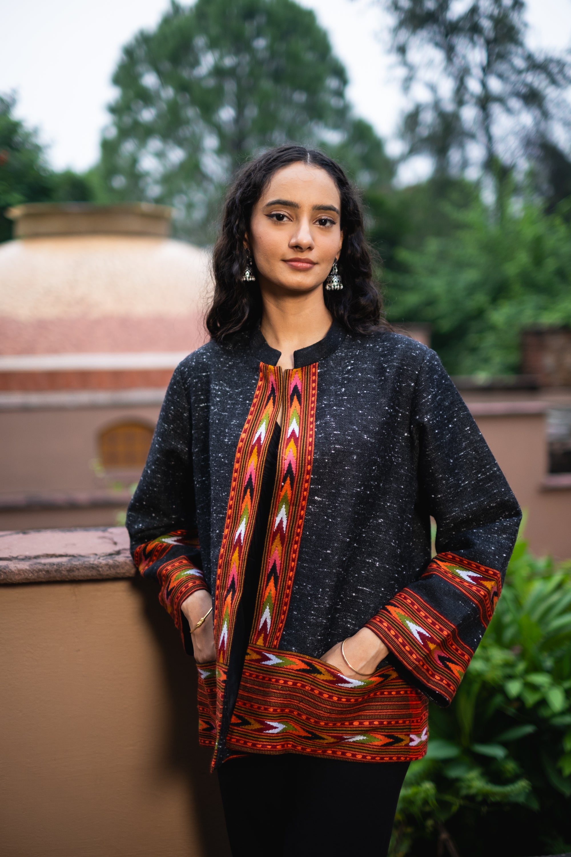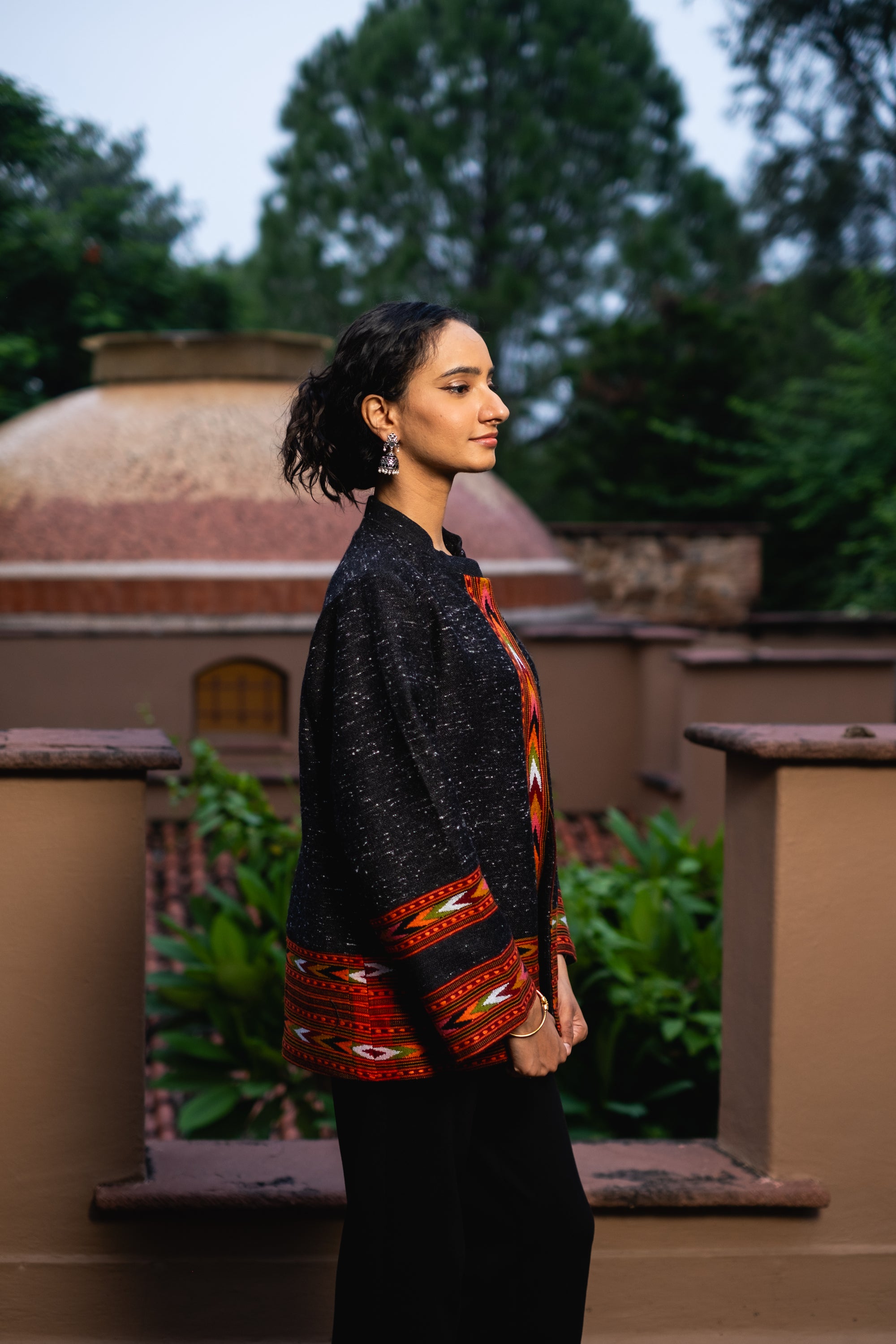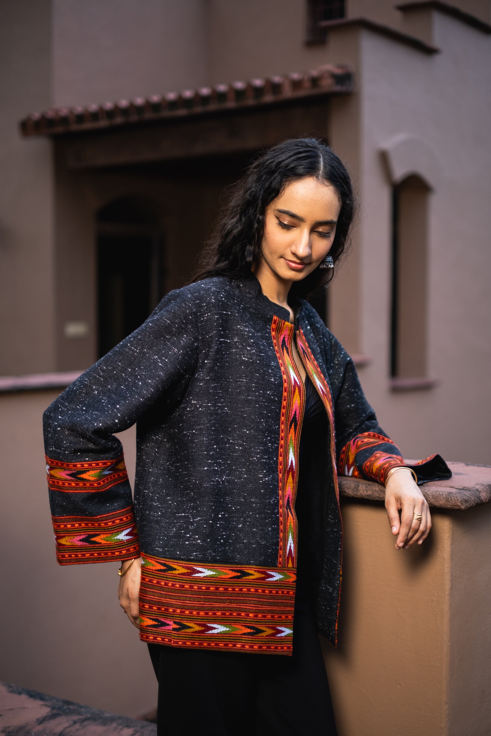 Monal Cropped Suit Jacket ~ Black with Multicoloured Border
