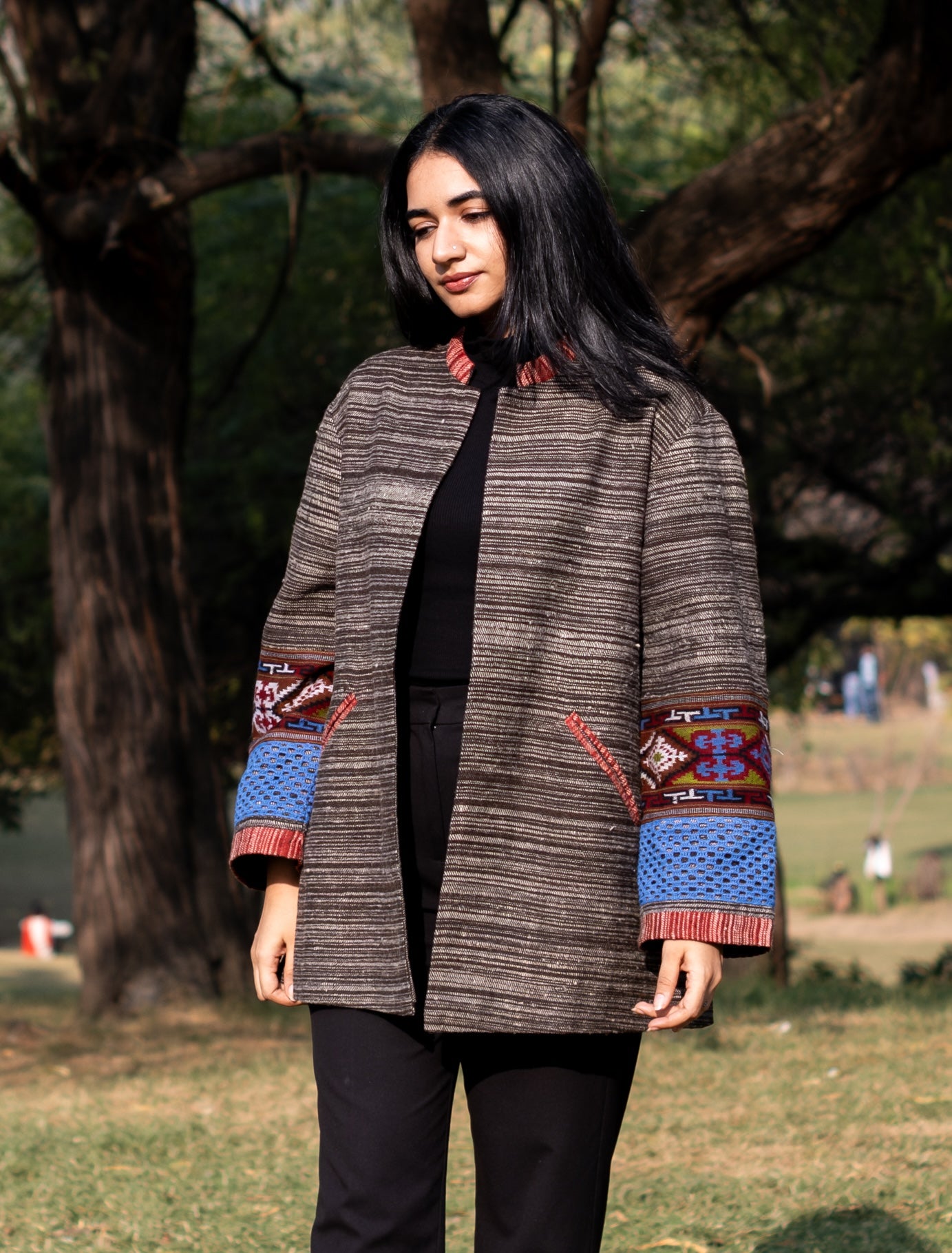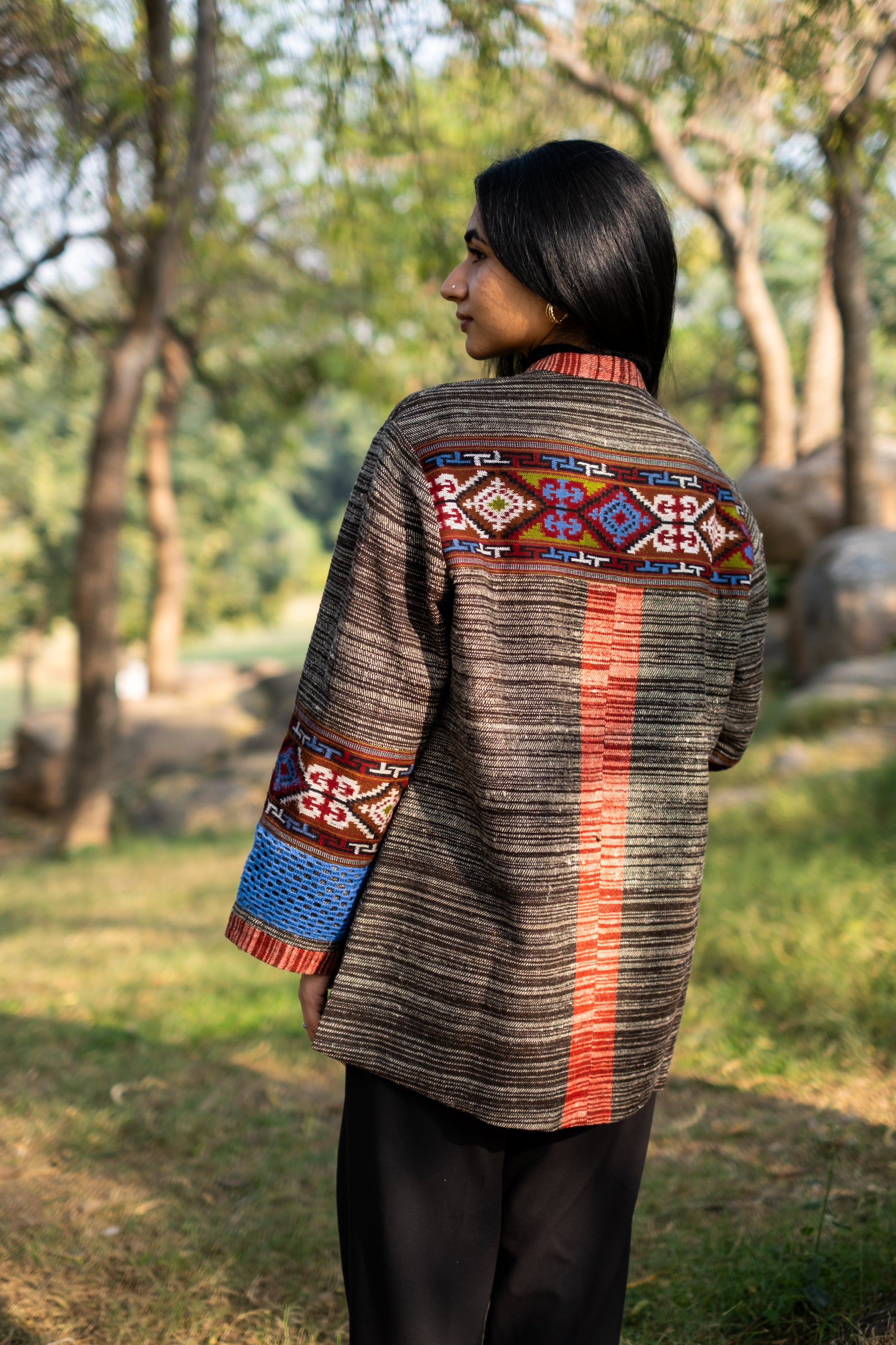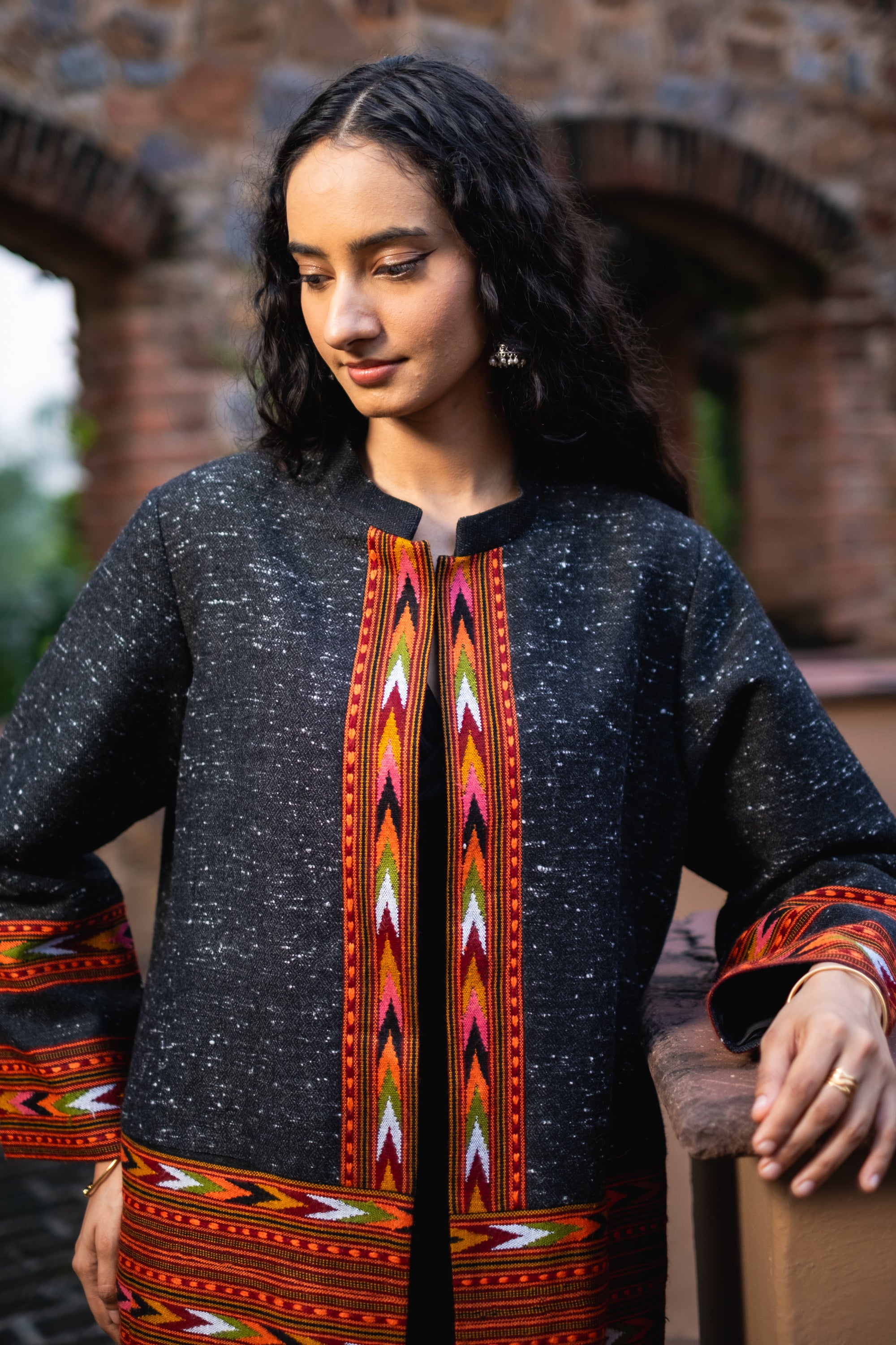 Monal Cropped Suit Jacket ~ Black with Multicoloured Border
