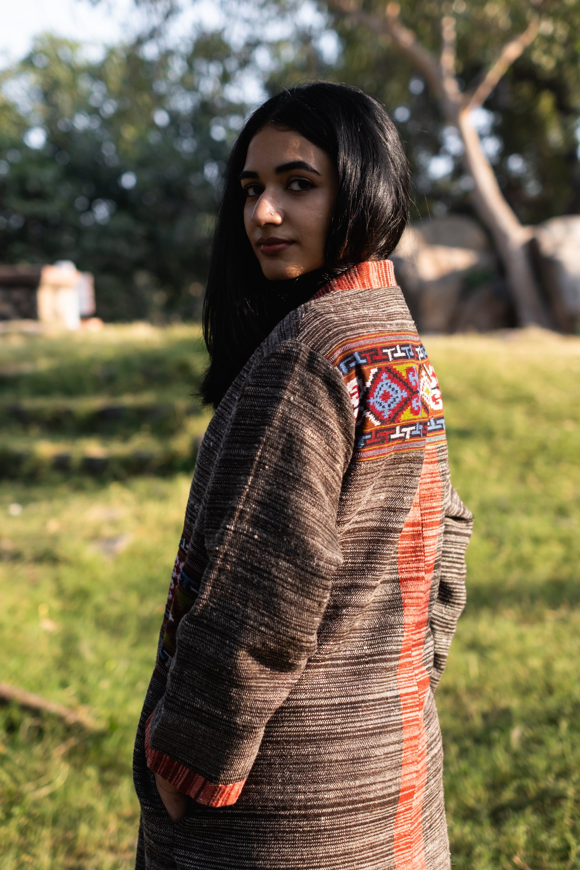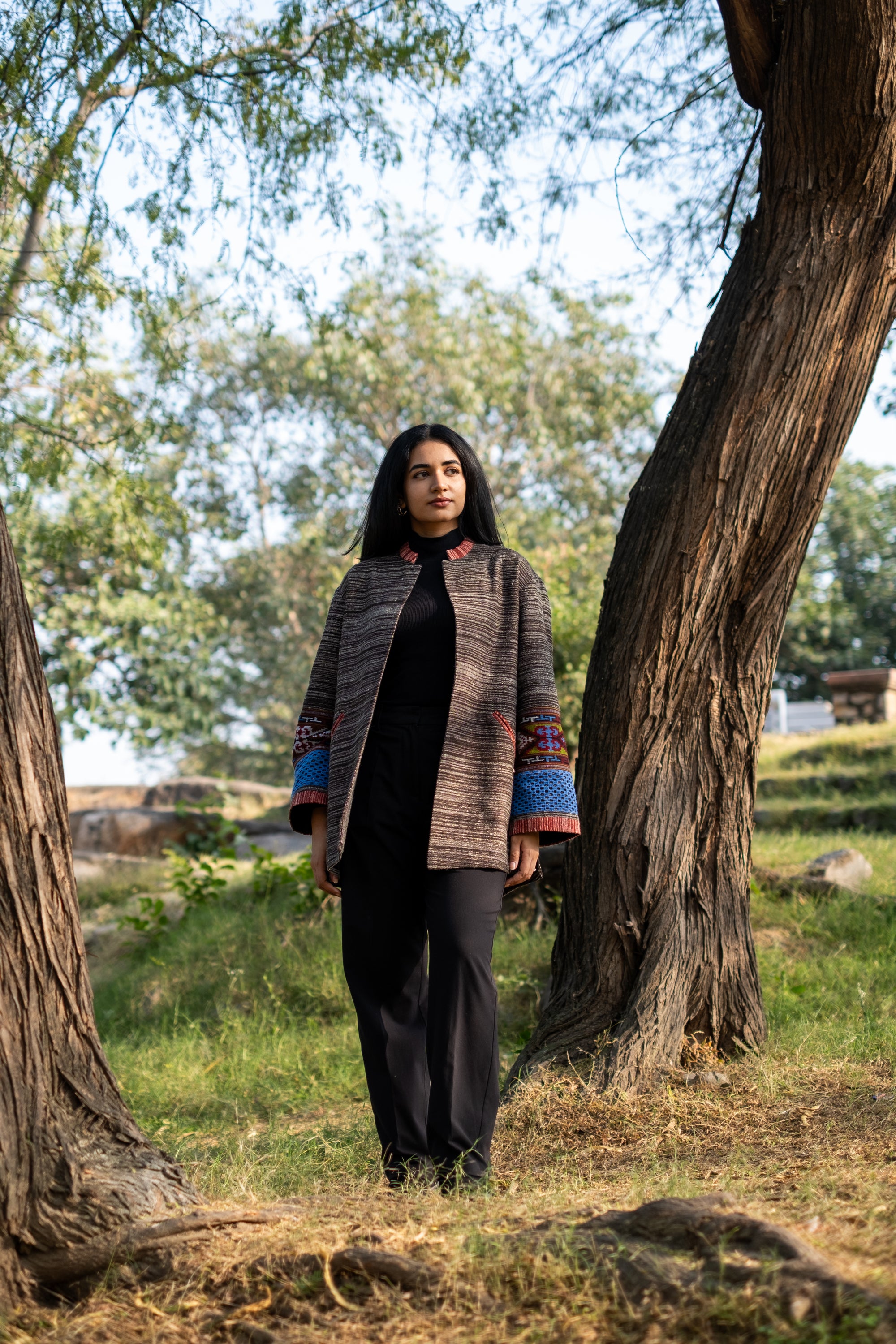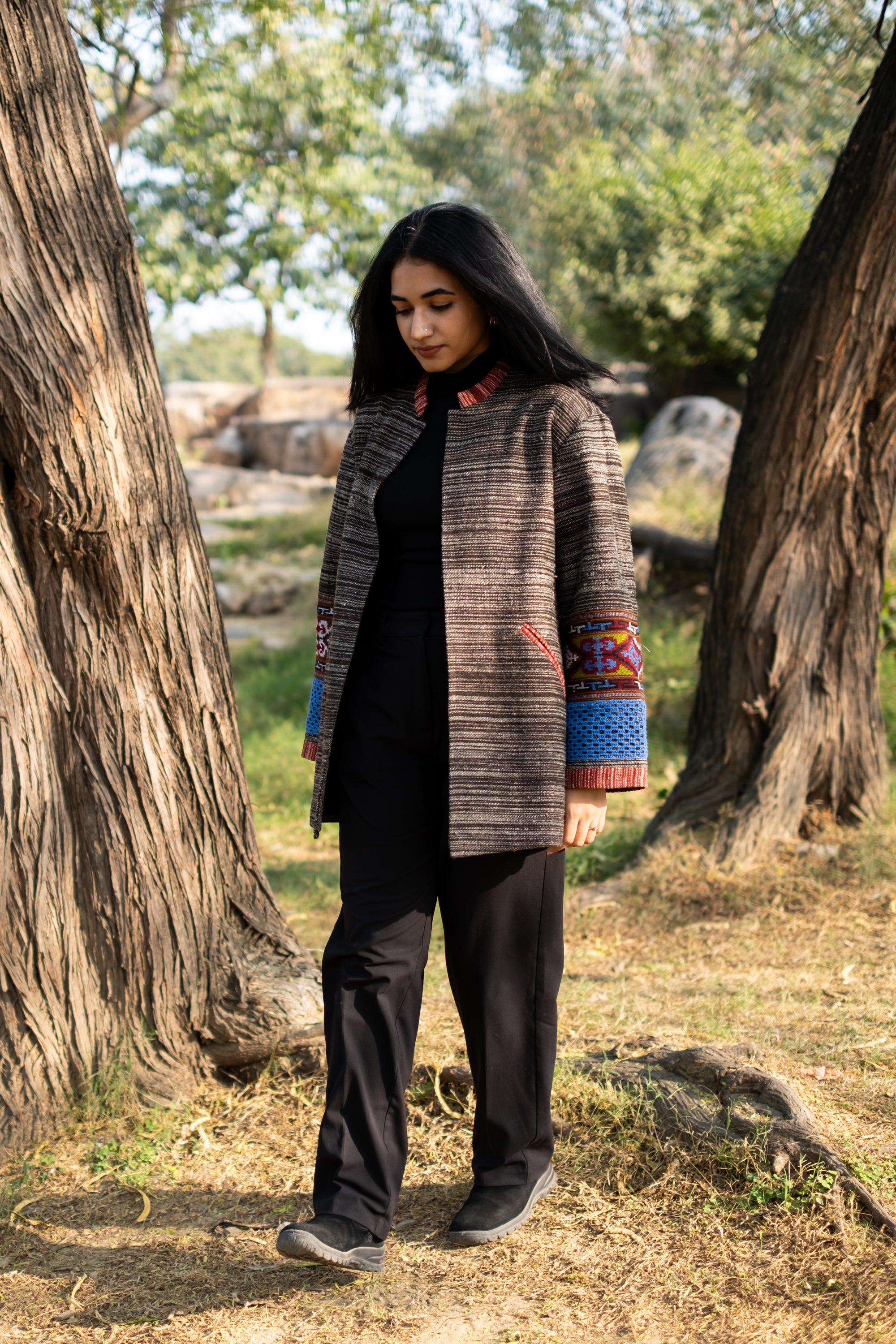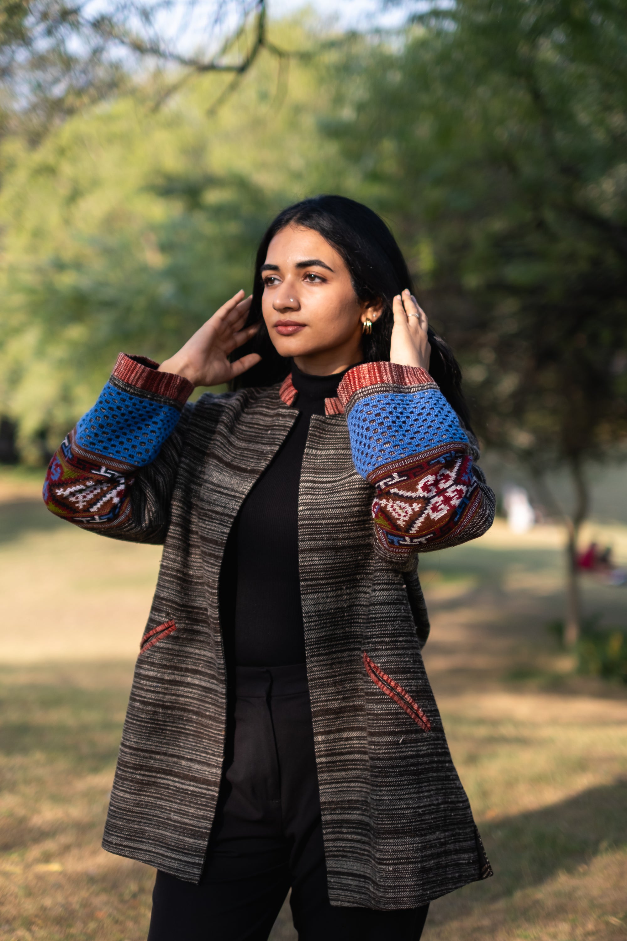 Monal Cropped Suit Jacket ~ Black with Multicoloured Border