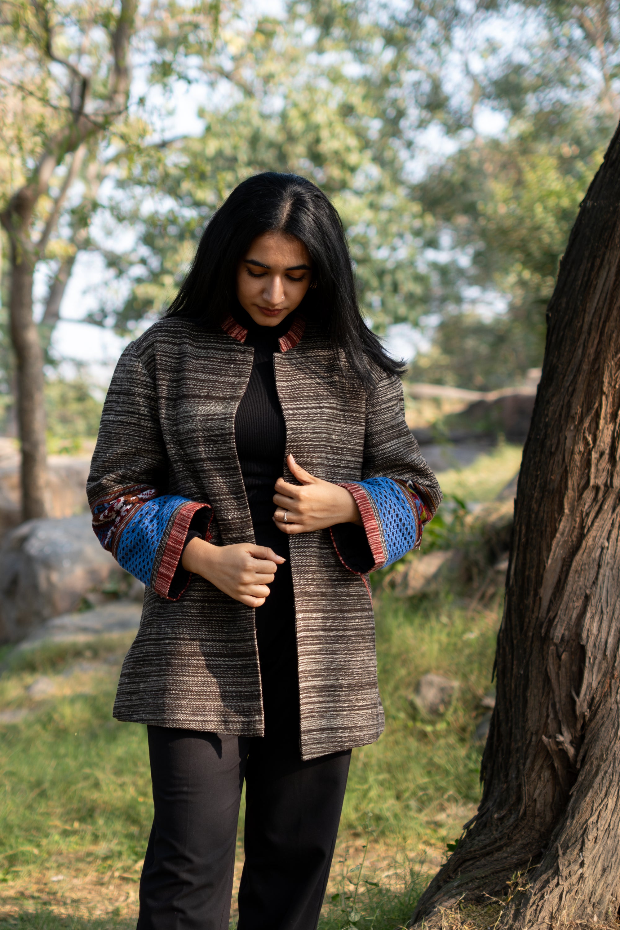 Monal Cropped Suit Jacket ~ Black with Brown Border